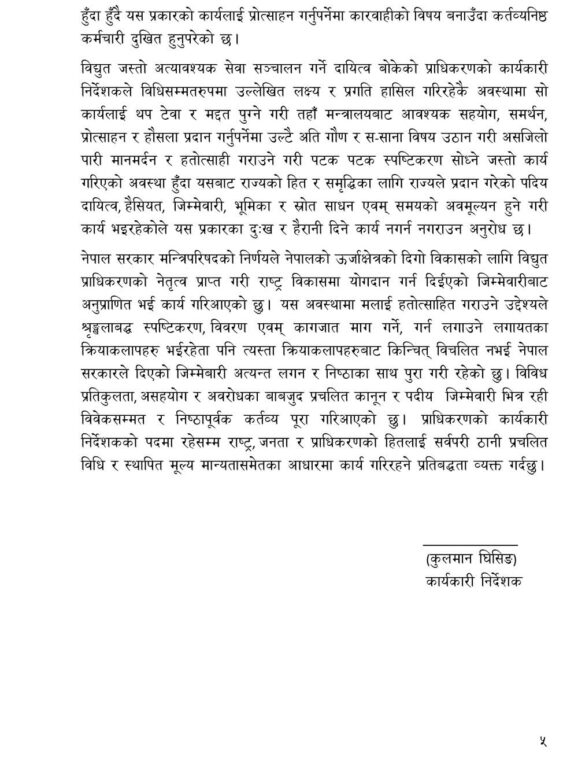 कुलमानले आफ्नो ऊर्जा मन्त्रालयलाई आफूलाई स्पष्टीकरण सोध्ने अधिकार नभएको जवाफ दिएका छन् ।
