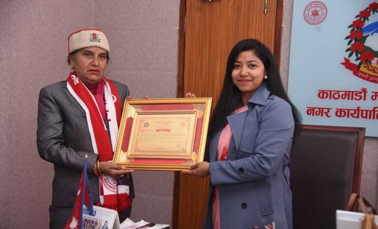 काठमाडौँ महानगरपालिकाले बुलेट आमा सुशीला उप्रेती तिवारीको बुलेट मोटरसाइकल यात्राको प्रशंसा गरेको छ । आज उपप्रमुख सुनिता डंगोलले उनलाई प्रशंसा पत्र प्रदान गर्दै आगामी अन्तरदेशीय यात्रा सफलताको शुभकामना दिइन् ।