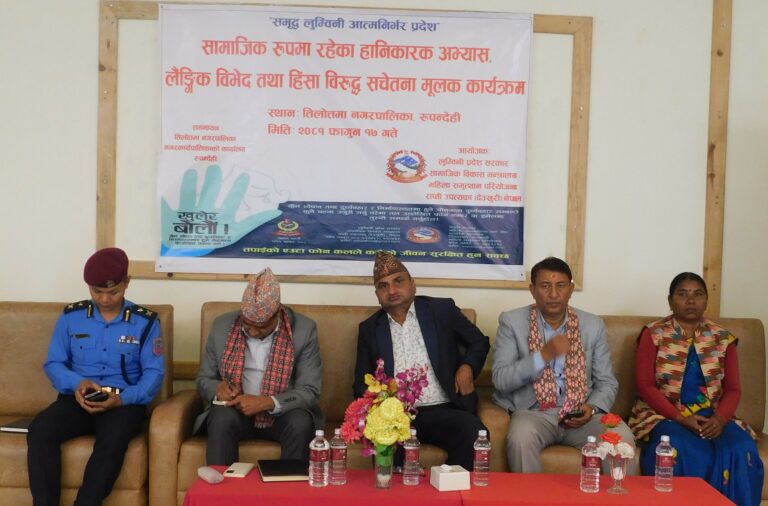 प्रदेशको सामाजिक विकास मन्त्रालय ,महिला समुत्थान परियोजनाले शनिवार तिलोत्तमामा आयोजना गरेको सामाजिक रुपमा रहेका हानिकारक अभ्यास, लैंगिक विभेद तथा हिंसा विरुद्ध सचेतना मुलक कार्यक्रममा बोल्दै उहांले त्यसबाहेक २३ प्रतिशत घटना घरकै अन्य सदस्यबाट हुने गरेको तथ्यांकले देखाएको चर्चा गर्नु भयो ।