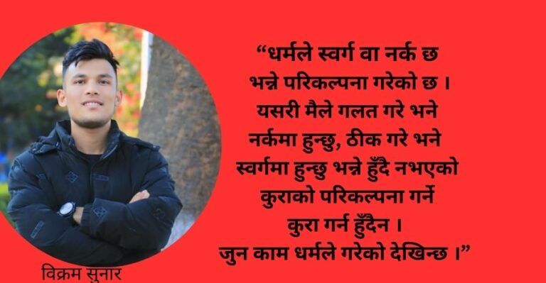 धर्मले स्वर्ग वा नर्क छ भन्ने परिकल्पना गरेको छ । यसरी मैले गलत गरेँ भने नर्कमा हुन्छु, ठीक गरे भने स्वर्गमा हुन्छु भन्ने हुँदै नभएको कुराको परिकल्पना गर्ने कुरा गर्न हुँदैन । जुन काम धर्मले गरेको देखिन्छ । हामीलाई त अहिल्यै अन्याय भयो, अहिल्यै न्याय चाहियो नि ! यो भन्दा पछि मरेर को कहाँ जान्छ भन्ने थाहा छैन । त्यसैले धर्म परिवर्तन व्यक्तिको स्वतन्त्रताको कुरा हो । व्यक्तिले आफ्नो इच्छाअनुसार गर्न सक्छ । हामीले मूलभूतरुपमा दलितमाथि भएको उत्पीडनको मुक्ति पाउने मामलामा धर्म परिवर्तन होइन, धर्म त्याग र भौतिकवादी यात्रामा अघि बढ्नै पर्छ ।