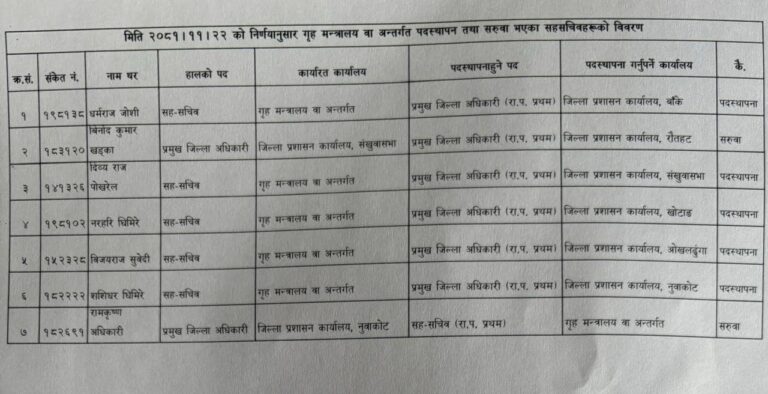 नुवाकोटमा शशिधर घिमिरेलाई पठाइएको छ । नुवाकोटमा रहेका रामकृष्ण अधिकारीलाई भने गृह मन्त्रालयमा सरुवा गरिएको छ ।