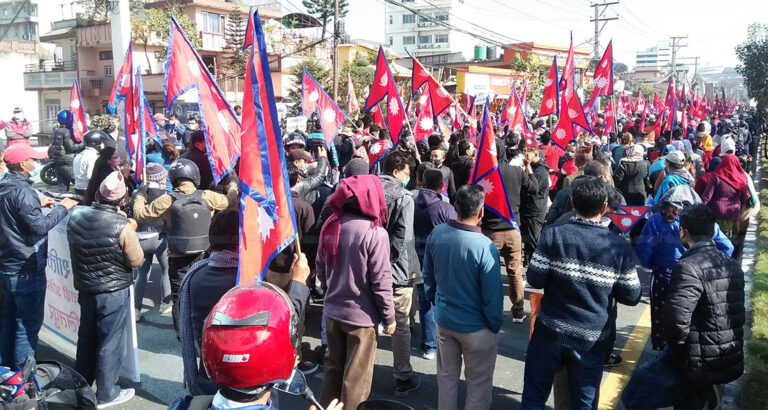 दलका नेतामाथि आक्षेप लगाउँदै आउँदो वैशाख १ गतेभित्र शीतलनिवासमा रहेका पूर्वराजा ज्ञानेन्द्रलाई नारायणहिटी भित्र्याउने भन्दै हरेक दिनजसो राष्ट्रिय झण्डाको दुरुपयोग गर्दै दरबारमार्गमा जम्मा हुनेहरूको भीड बढ्दो अवस्थामा रहेको छ ।