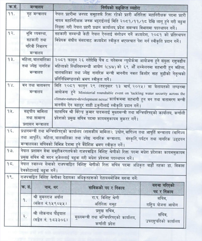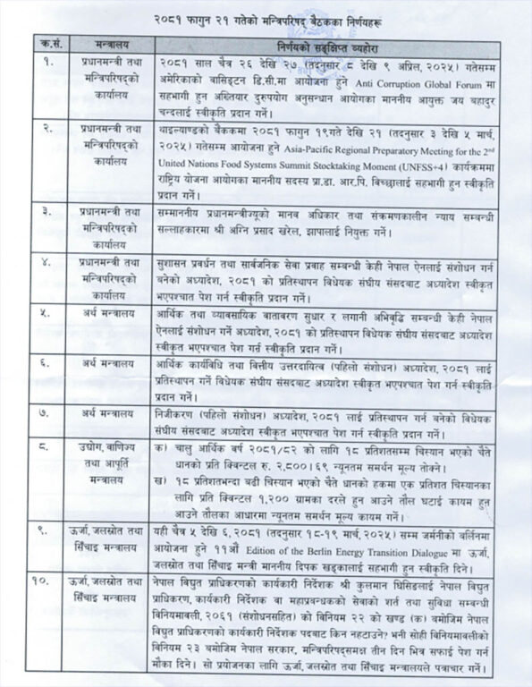 मन्त्रिपरिषद्को बैठकले गरेका विभिन्न १९ निर्णयहरु सार्वजनिक गरिएको छ ।