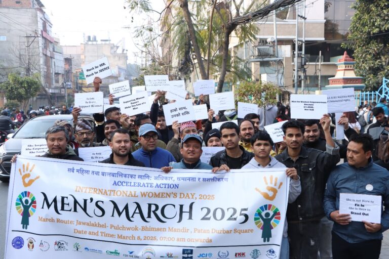 अन्तर्राष्ट्रिय महिला दिवसको अवसरमा शनिबार ललितपुरमा महिला हिंसा अन्त्य सँगै लैङ्गिक समानता भएको समाज निर्माणका लागि ऐक्यबद्धता जनाउँदै सयौँ पुरुषहरुले मार्च गरेका छन् ।