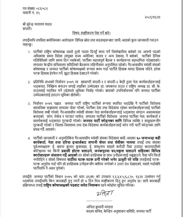 पार्टीमा कोषाध्यक्ष यादवबिरुद्ध पटक–पटक ठगी गरेको भनेर पीडित पक्षबाट उजुरी परेपछि पीडितहरुको हरहिसाब क्लियर गर्न पटक–पटक अनुरोध गर्दा पनि सो नगरेको र उल्टै दम्भ देखाएका कारण आज पार्टीले निलम्बन सहित स्पष्टीकरण माग गरेको सो पार्टीका प्रवक्ता डा.शरदसिंह यादवले जानकारी दिनुभयो ।