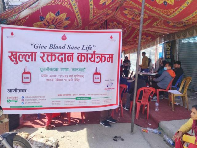समृद्धि फाइनान्स कम्पनीको आयोजनामा पुतलीसडकमा रक्तदान कार्यक्रम सम्पन्न भएको छ । काठमाडौं महानगरपालिका र नेपाल रेडक्रस सोसाइटीको सहकार्यमा आयोजित उक्त कार्यक्रममा ७२ पिन्ट रगत संकलन गरिएको थियो ।