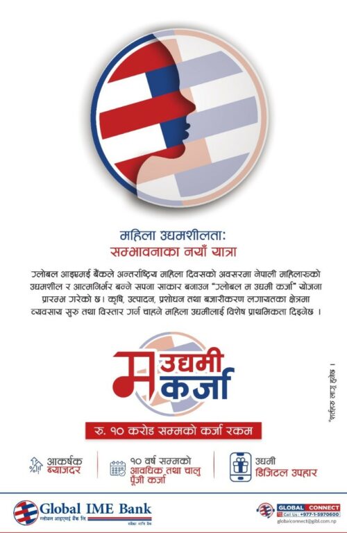 ग्लोबल आइएमई बैंकले साना तथा मझौला उद्यमी लक्षित ग्लोबल ‘म उद्यमी कर्जा’ सार्वजनिक गरेको छ । महिला उद्यमीहरुलाई वित्तीय सहजीकरण गर्ने उद्देश्यसहित रोजगारीको विकास, सामाजिक विकास र स्थानीय समुदायहरुमा आर्थिक सशक्तिकरणमा सहयोग पुग्ने गरी बैंकले उक्त कर्जा ल्याएको हो ।