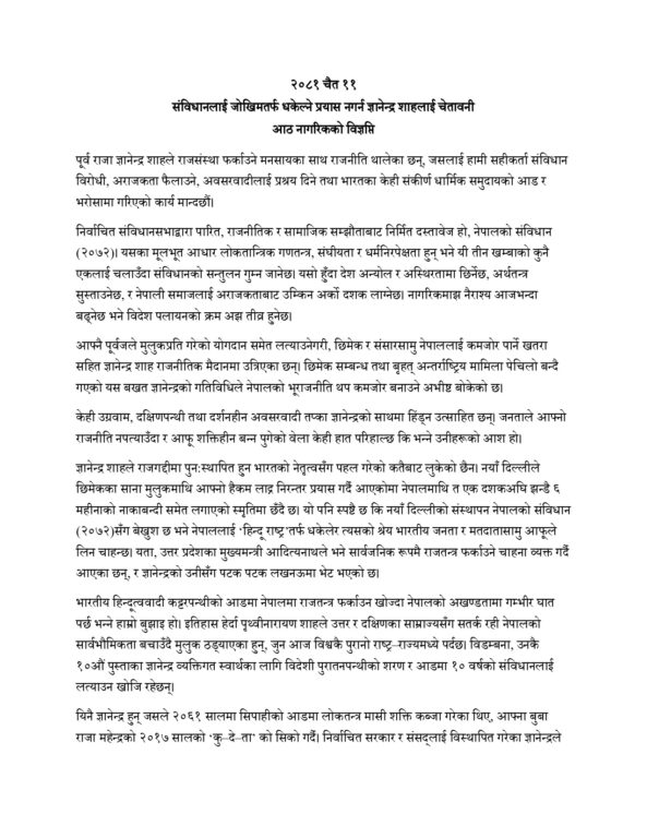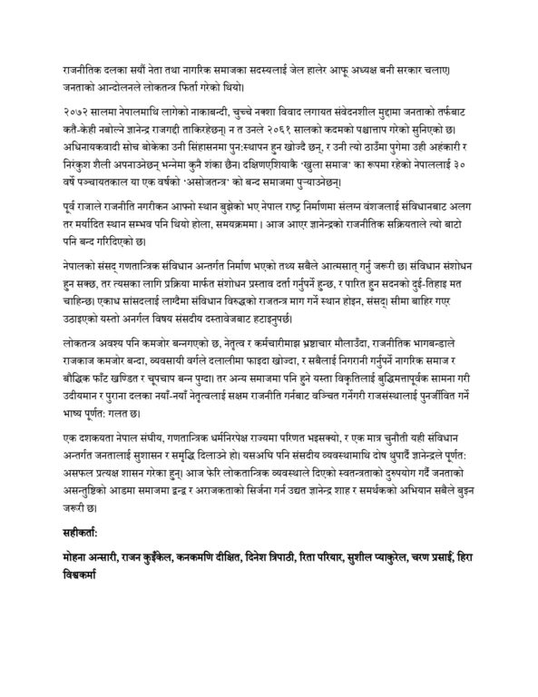 “एक दशकयता नेपाल संघीय, गणतान्त्रिक, धर्मनिरपेक्ष राज्यमा परिणत भइसक्यो र एक मात्र चुनौती यही संविधान अन्तर्गत जनतालाई सुशासन र समृद्धि दिलाउने हो,” उनीहरूले भनेका छन्, “यसअघि पनि संसदीय व्यवस्थामाथि दोष थुपार्दै ज्ञानेन्द्रले पूर्णतः असफल प्रत्यक्ष शासन गरेका हुन्। आज फेरि लोकतान्त्रिक व्यवस्थाले दिएको स्वतन्त्रताको दुरुपयोग गर्दै जनताको असन्तुष्टिको आडमा समाजमा द्वन्द्व र अराजकताको सिर्जना गर्न उद्यत ज्ञानेन्द्र शाह र समर्थकको अभियान सबैले बुझ्न जरूरी छ।”
