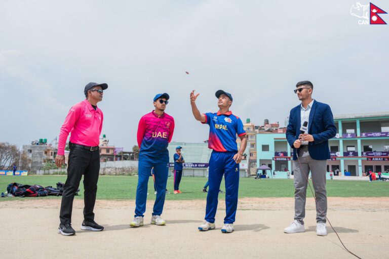 यू–१९ विश्वकप एसिया क्षेत्रको छनोट खेलमा नेपालले टस हारेको छ । यूएइका कप्तान पृथ्वी मधुले टस जितेर नेपाललाई ब्याटिङका लागि निम्तो दिएका छन् ।