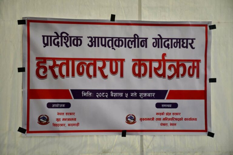 गृहमन्त्री रमेश लेखकले विपद्का अवस्थामा तत्काल उद्धार तथा राहत सामग्री सहज रूपमा उपलब्ध गराउने उद्देश्यले निर्माण गरिएको प्रादेशिक आपतकालीन गोदामघर गण्डकी प्रदेशलाई औपचारिक रूपमा हस्तान्तरण गरेका छन् ।