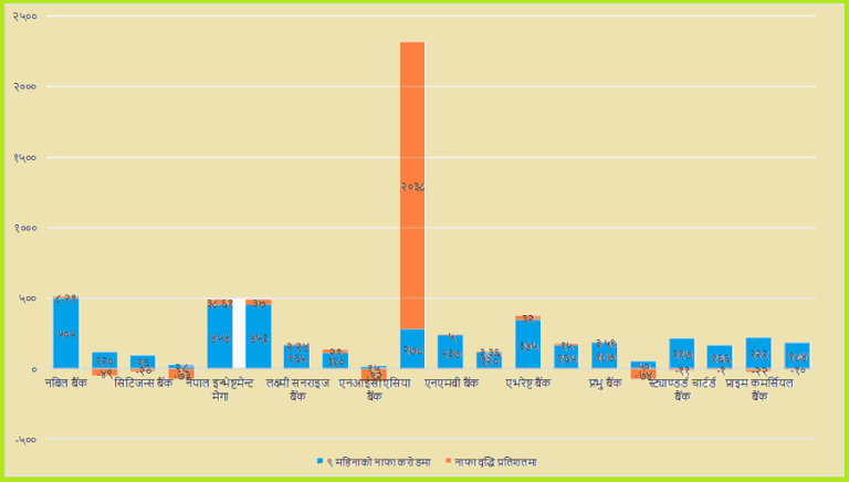 गत वर्षको तुलनामा सबैभन्दा बढी नाफा नेपाल बैंक लिमिटेडले गरेको छ । अघिल्लो वर्षको तेस्रो त्रैमाससम्म १३ करोड ५ लाख रुपियाँ नाफा कमाएको सो बैंकले यस वर्ष सोही अवधिमा नाफा २ अर्ब ७८ करोड ३४ लाख रुपियाँ पु¥याएको छ, जुन २०३२.८० प्रतिशतले वृद्धि हो ।