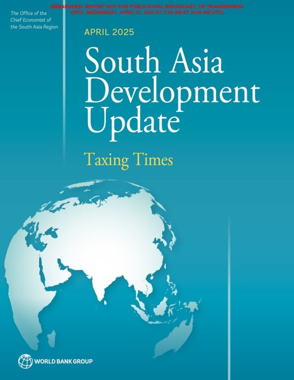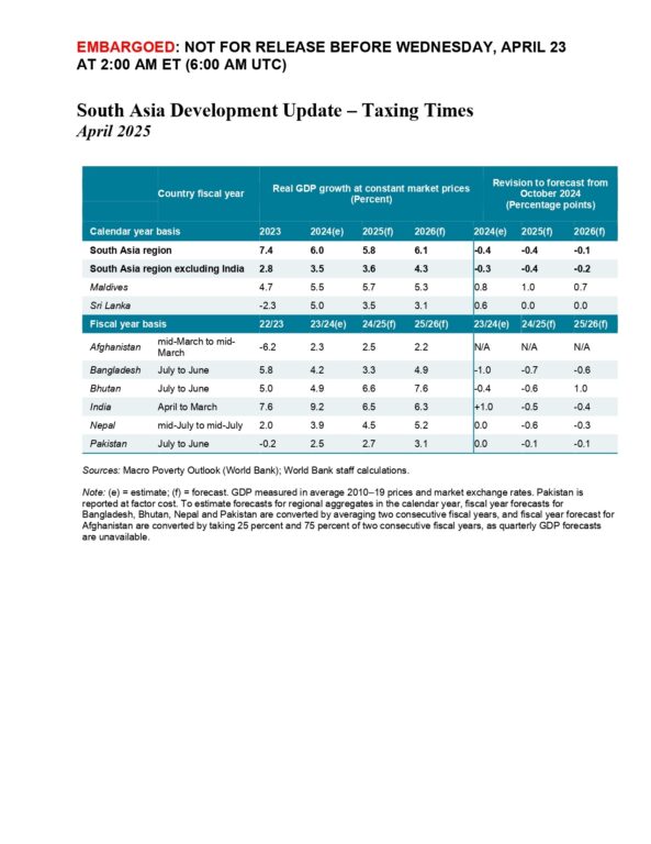 विश्व बैंकको दुईपटक वार्षिक प्रकाशित हुने ‘दक्षिण एशिया विकास अद्यावधिक रिपोर्ट : करको समय’ अनुसार, सन् २०२५ मा दक्षिण एशियाको आर्थिक वृद्धि ५.८ प्रतिशतमा सीमित हुने अनुमान गरिएको छ, जुन अघिल्लो अक्टोबरको प्रक्षेपणभन्दा ०.४ प्रतिशत अंक कम हो । सन् २०२६ मा भने यो वृद्धि दर ६.१ प्रतिशतमा पुग्ने अपेक्षा गरिएको छ । यद्यपि, विश्वव्यापी अनिश्चितता र आन्तरिक कमजोरीहरू, जस्तै सीमित वित्तीय क्षमताले जोखिम अझै उच्च रहेको रिपोर्टमा उल्लेख छ।