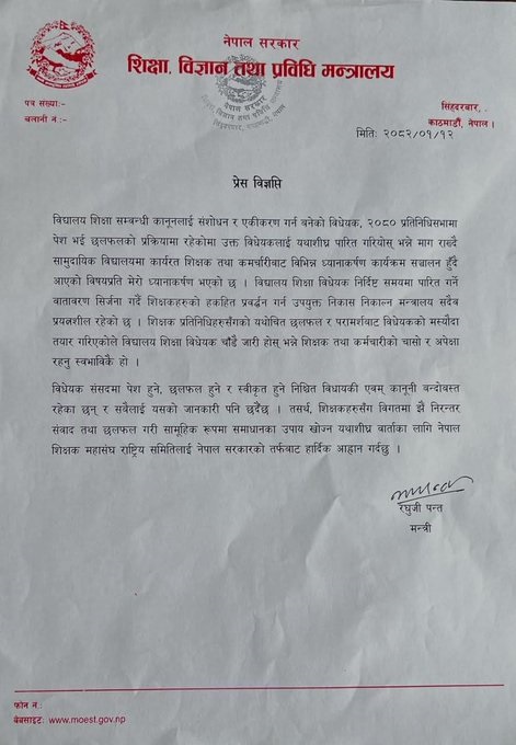 सपथ ग्रहण तथा पदभार ग्रहण गरेको भोलीपल्ट नवनियुक्त शिक्षा, विज्ञान तथा प्रविधिमन्त्री रघुजी पन्तले आन्दोलनरत शिक्षकहरूलाई वार्तामा बोलाएका छन् ।