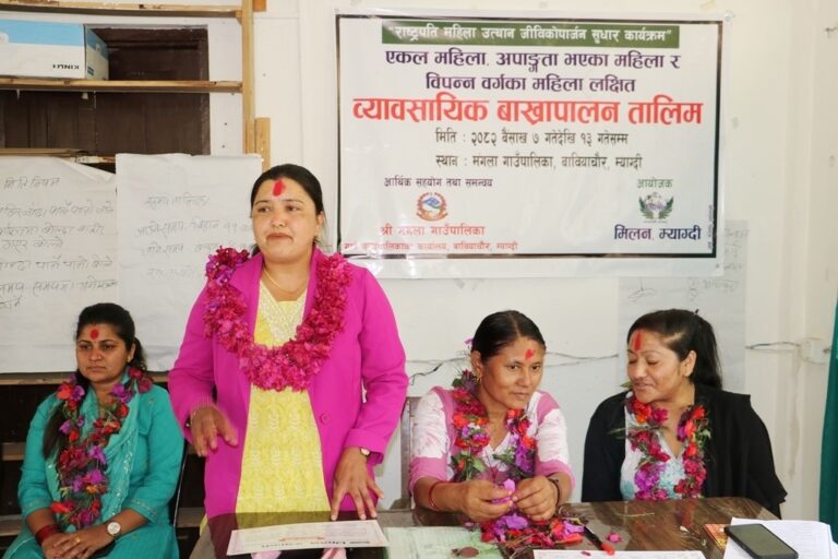मंगला गाउँपालिकाको आर्थिक सहयोग तथा समन्वय र मिलन म्याग्दीको आयोजनामा बाख्रापालन तालिम सञ्चालन गरिएको थियो । ‘राष्ट्रपति महिला उत्थान जीविकोपार्जन सुधार कार्यक्रम’ अन्तर्गत एक हप्तासम्म चलेको तालिममा मंगला गाउँपालिकाको ५ वटा वडाबाट २५ जना एकल महिला, अपाङ्गता भएका महिला र विपन्न वर्गका महिलाहरुलाई समेटेर तालिम दिइएको छ ।