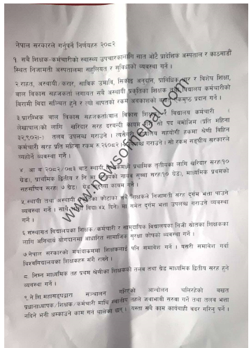 शिक्षा, विज्ञान तथा प्रविधि मन्त्रालयले शिक्षक महासंघसंग सरकारले तत्काल पूरा गर्नुपर्ने माग प्रस्तावको रुपमा पेस गर्न आग्रह गरेपछि ९ बुँदे पठाएको छ । सम्भवतः भोली सोमबार बस्ने मन्त्रीपरिषदको बैठकअघि मन्त्रालयले ९ बुँदे निर्णय मन्त्री परिषदमा पेस गर्न लागेको हो ।