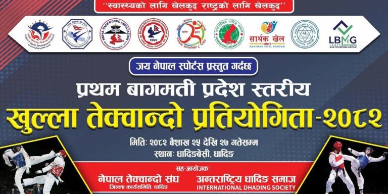 जय नेपाल स्पोर्टस धादिङको आयोजना तथा नेपाल तेक्वान्दो संघ धादिङको तथा अन्तरराष्ट्रीय धादिङ समाज को सह आयोजनामा धादिङबेसीमा बागमती प्रदेश स्तरीय तेक्वान्दो प्रतियोगिता हुने भएको छ ।