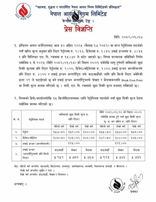 त्यस्तै हवाई इन्धनमा आन्तरिकबतर्फ प्रतिलिटर चार रुपैयाँ मूल्य घटाइएको छ ।