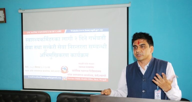 स्वास्थ्यकर्मीहरुका लागि दुईदिने गर्भवती सेवा तथा सुत्केरी सेवा निरन्तरता सम्बन्धी विषयमा शुक्रवार अभिमुखीकरण कार्यक्रम सम्पन्न भएको छ । प्रदेश जनस्वास्थ्य कार्यालय म्याग्दीको आयोजनामा जिल्लाको विभिन्न स्वास्थ्य संस्थाहरुमा कार्यरत स्वास्थ्यकर्मीहरुलाई लक्षित गरेर अभिमुखीकरण गरिएको हो ।