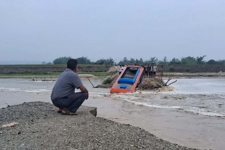 चौदण्डीगढी नपा ५ वडाध्यक्ष तुलसी ढकालले बस राती त्रियुगा नदीको बालुवा रहेको भासमा फसेकोले जेसिवी, क्रेन ल्याएर निकाल्ने काम भैरहेको जानकारी दिँदै बस पहिले भत्केको पुल भन्दा १०० मिटर पश्चिम होम पाइप राखेर मोटरसाइकल तथा साना गाडीहरु संचालन गर्नकालागि बनाइएको अस्थायी बाटोबाट ल्याइएको तर सोमबार साँझ परेको पानीले नदीमा बाढी आएको थियो । पानी निकै राम्रोसँग आएकोले नदी तथा खहरेहरुमा पनि बाढीबढेपछि त्रियुगा नदीमा पानीको बहाव बढेर अस्थायी रुपमा होमपाइप राखेर बनाइएको बाटो बगाएको र त्यहाँ बालुवा थुप्रिएकोले सोही ठाउँमा बस फसेको वडाध्यक्ष ढकालले बताए ।