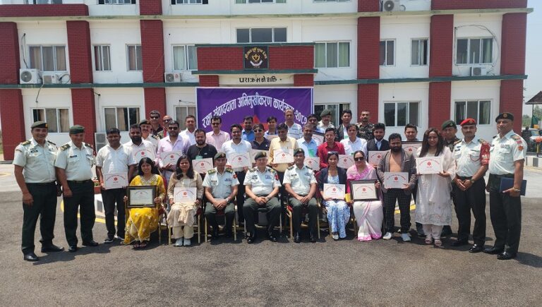 समापन समारोहमा मध्य पूर्वी पृतनाका चिफ अफ स्टाफ सहायक रथी भूवन खत्रीले अभिमुखीकरण कार्यक्रम सफलतापूर्वक सम्पन्न गर्ने सञ्चारकर्मीहरूलाई बधाई ज्ञापन गर्दै प्रमाणपत्र वितरण गरे ।
