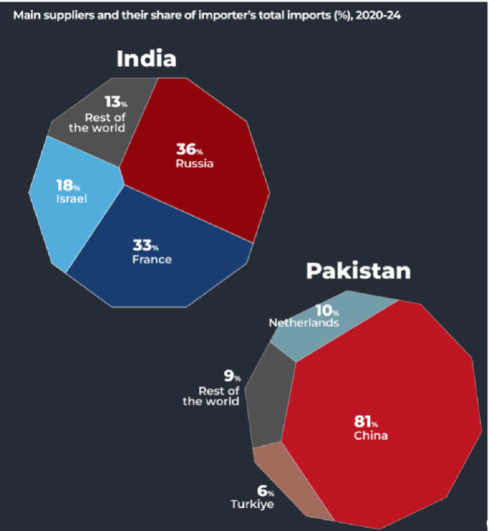 पाकिस्तानले चीन टर्की, नेदरल्यान्डस्लगायतका देशबाट हतियार आयात गर्दै आएको छ , वैश्विक सन्दर्भमा, पाकिस्तान विश्वको पाँचौं ठूलो हतियार आयातकर्ता बनेको छ। सन् २०२०–२४ मा पाकिस्तानले कुल विश्व हतियार आयातको ४.६ प्रतिशत हिस्सा ओगटेको थियो। भारत र पाकिस्तानको हतियार खरिदमा देखिएको यो प्रवृत्तिले दक्षिण एसियाली सुरक्षा सन्तुलनमा थप जटिलता थप्ने विश्लेषकहरूको ठम्याइ छ।