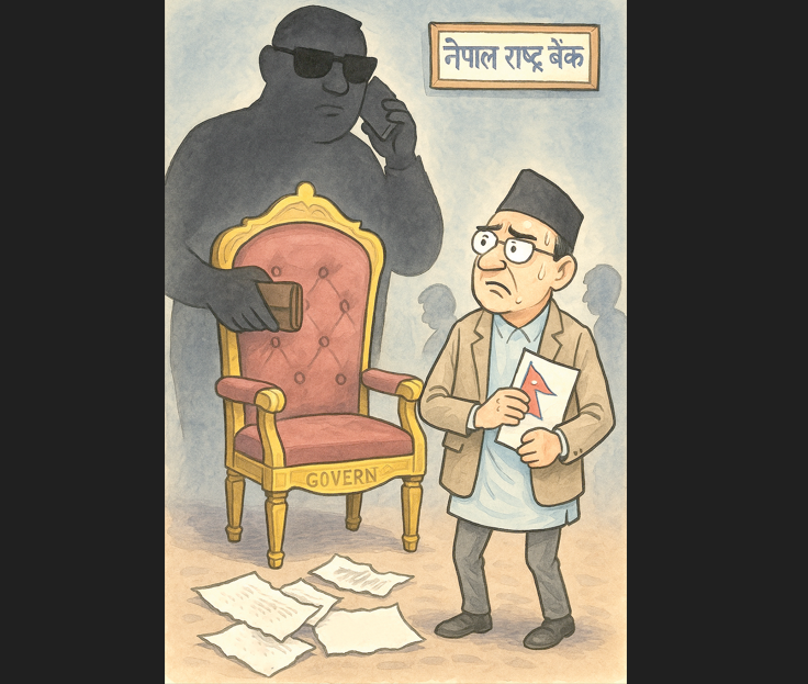 तर, गभर्नर नियुक्तिको संवेदनशील विषय अहिले बिचौलिया र सत्ताभित्रका शक्ति खेलको अखडा बन्न पुग्दा केपी शर्मा ओली नेतृत्वको दुई तिहाइको सरकार निरीह भएको छ । एक महिनादेखि गभर्नर पद रिक्त छ तर सरकार कानुनअनुसार गभर्नर पद सयममा नै पदपूर्ति गर्न असफल देखिएको छ । तत्कालीन गभर्नर महाप्रसाद अधिकारीको कार्यकाल सकिएको एक महिना नाघिसक्दा पनि सरकारले गभर्नर नियुक्त गर्न नसकेको हो । राष्ट्र बैंकजस्तो निकाय नेतृत्वविहीन भई अर्थतन्त्र संवेदनहीन बन्दै गइरहँदा ओली नेतृत्वको सरकार गभर्नर चयनमा राजनीतिक सौदाबाजी र शक्ति सन्तुलनको दलदलमा फसेको छ । अहिले गभर्नर नियुक्ति अनिश्चित जस्तै बन्न पुगेको छ । सिफारिस समिति नै बारम्बार अपांगजस्तै बन्दै आएको छ ।