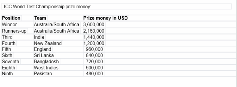 अन्तर्राष्ट्रिय क्रिकेट परिषद् (आइसिसी) ले आगामी विश्व टेस्ट च्याम्पियनसिप (डब्ल्यूटीसी) को पुरस्कार रकम घोषणा गरेको छ । प्रतियोगिताको विजेताले ३६ लाख तथा उपविजेताले २१ लाख ६० हजार अमेरिकी डलर प्राप्त गर्नेछन् ।