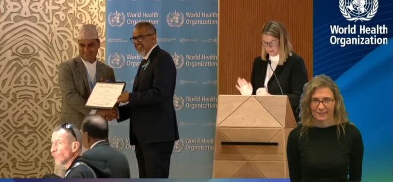 स्वीट्जरल्याण्डको जेनेभामा आयोजित विश्व स्वास्थ्य संगठनको ७८ औँ महासभामा भाग लिन गएका स्वास्थ्य मन्त्री प्रदीप पौडेललाई आज आयोजित विशेष समारोहमा डब्लुएचओका महानिर्देशक डा डेटरोस अधानोम ग्रेब्रेयससले सो अवार्ड प्रदान गरेका हुन् ।
