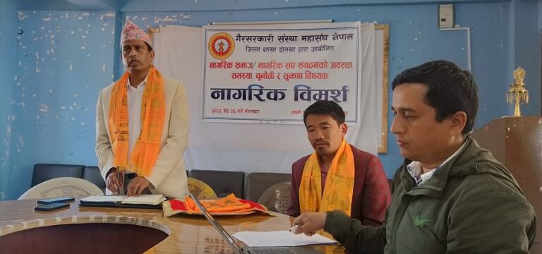 पछिल्लो समय दोलखामा नागरिक समाजको भूमिका कम्जोर बन्दै गएको परिप्रेक्षमा विगतको समिक्षा तथा आगामी कार्ययोजना सहित नागरिक समाज एवम् नागरिक संघ– संस्थाको भूमिका खोज्ने अभियान अन्तर्गत नागरिक विमर्श कार्यक्रम आयोजना गरिएको गैसस महासंघ नेपाल दोलखाका अध्यक्ष नेत्र मोक्तानले बताए ।