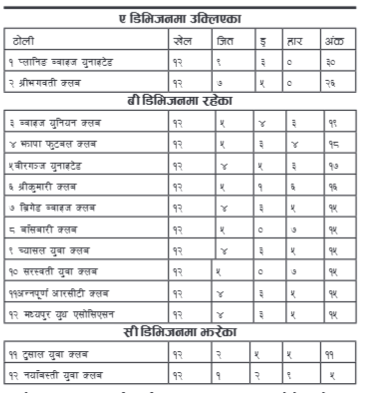 जित्ने होडमा समेत प्लानिङ ब्वाइज सबैभन्दा अगाडि रह्यो । प्लानिङ ब्वाइजले जारी लिगमा १२ खेल खेल्दै ९ खेलमा जित हासिल गरेको छ । यदि अन्तिम खेल पनि जितेमा जारी लिगमा दोहोरो अंकमा जित हासिल गर्ने एक मात्र टोली हुनेछ । श्रीभगवतीले १२ खेल खेल्दा ७ खेलमा जित हासिल गरेको छ । सरस्वती युवा क्लब, आरसीटी, ब्वाइज युनियन, मध्यपुर युथ एसोसिएसन, ब्रिगेड ब्वाइज क्लब, बाँसबारी क्लब र च्यासल युवा क्लब ए डिभिजन खेलिसकेका टोलीहरू हुन् । यसमा ब्वाइज युनियनबाहेक बाँकी टोलीहरुले बी डिभिजनमै रहन संघर्ष गर्नुपरेको थियो ।