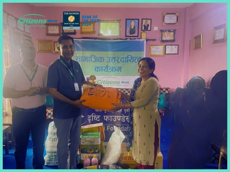 सिटिजन्स बैंक इन्टरनेसनल लिमिटेडले संस्थागत सामाजिक उत्तरदायित्व अन्तर्गत सुदूरपश्चिम प्रदेशको धनगढीमा क्रियाशील दृष्टि फाउण्डेसन नेपाललाई सहयोग गरेको छ । लामो समयदेखि मानसिक स्वास्थ्य समस्या भोगिरहेका र परिवारविहीन महिलाहरू तथा तिनका बालबालिकाहरूको सेवामा समर्पित यस संस्थालाई बैंकले करिब दुई महिनासम्म पुग्ने सरसफाइ तथा उपभोग्य सामग्रीहरू हस्तान्तरण गरेको छ ।