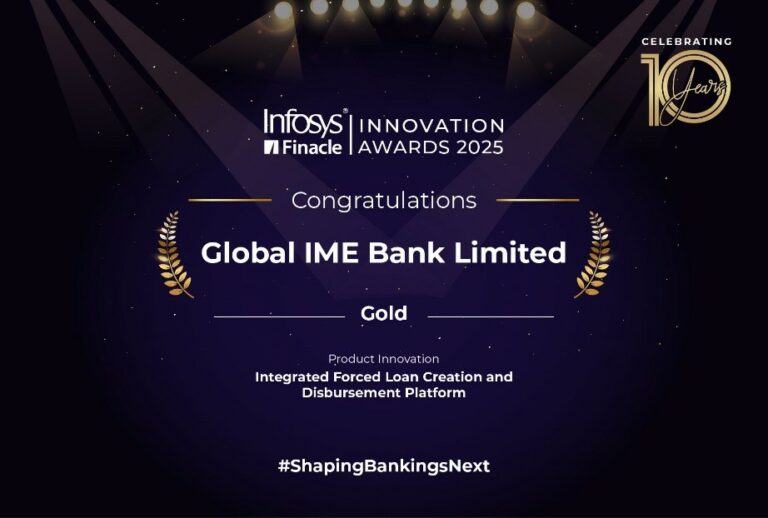 ग्लोबल आइएमई बैंक लिमिटेड इन्फोसिस फिनाकल इनोभेसन अवार्ड २०२५ मा प्रोडक्ट इनोभेसन विधा अन्तर्गत गोल्ड अवार्डबाट सम्मानित भएको छ ।