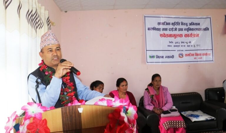 म्याग्दीको अन्नपूर्ण गाउँपालिका–६, घारमा सामाजिक कुरिती विरुद्धको अभियानअन्तर्गत बालविवाह र दाइजो प्रथा न्यूनीकरणका लागि सचेतनामूलक कार्यक्रम सम्पन्न भएको छ । सामाजिक विकास कार्यालय र मिलन म्याग्दीको आयोजना तथा अन्नपूर्ण गाउँपालिकाको सहकार्यमा शुक्रवार कार्यक्रम गरिएको हो ।