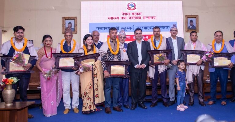 विश्व सुर्तीजन्य पदार्थरहित दिवसको अवसर पारेर स्वास्थ्य तथा जनसंख्या मन्त्रालयले सुर्तीजन्य पदार्थको आयात, उत्पादन, विक्री वितरण तथा सेवन गर्ने कार्यलाई न्युनिकरण, नियन्त्रण तथा नियमन गर्ने कार्यमा उल्लेखनीय योगदान पुर्याएको भन्दै स्वास्थ्य मन्त्री प्रदीप पौडेल तथा सचिव डा विकास देवकोटाले अवार्ड प्रदान गरेका हुन्।