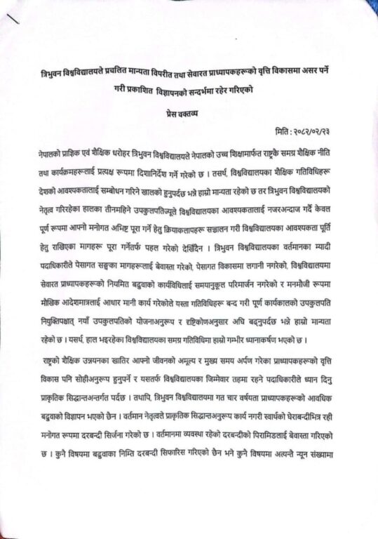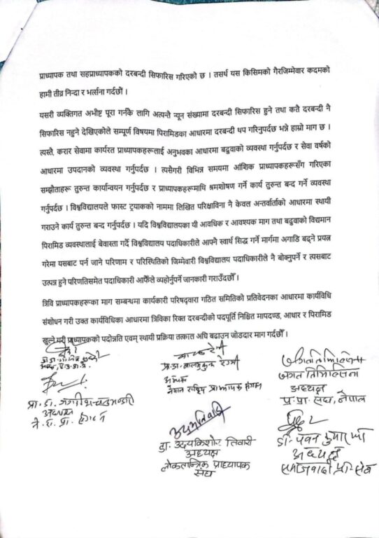 त्रिविका मागका सम्बन्धमा कार्यकारी परिषदबाट गठित समितिको प्रतिवेदनको आधारमा कार्यबिधि संसोधन गरी सो कार्यबिधिको आधारमा रिक्त दरबन्दीको पदपुर्ति निश्चित मापदण्ड, आधार र पिरामिड खुल्नेगरी तत्काल पदोन्नति र स्थायी प्रक्रिया तत्काल अघि बढाउन प्राध्यापक संघ संगठनले आग्रह गरेका छन् ।