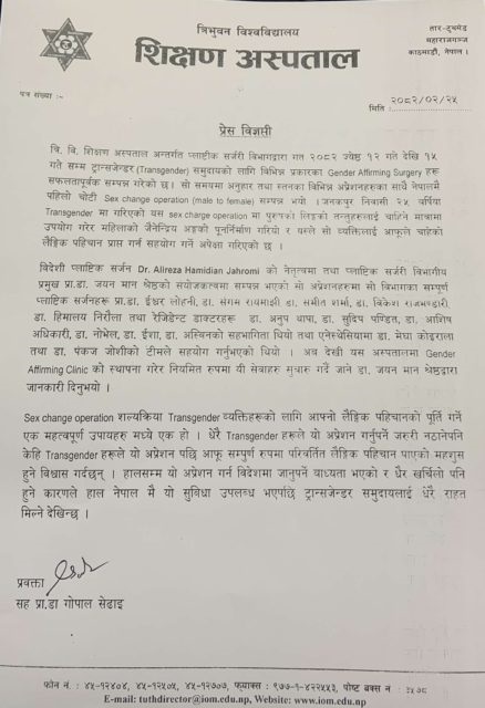 अस्पतालले आइतबार आयोजना गरेको पत्रकार सम्मेलनमार्फत जनकपुर निवासी २५ वर्षीया ट्रान्सजेन्डर व्यक्तिको ‘मेल टु फिमेल’ सेक्स चेन्ज अपरेसन सफल भएको जानकारी गराइएको हो । त्रिविको प्लास्टिक सर्जरी विभागले जेठ १२ देखि १५ गतेसम्म ट्रान्सजेन्डर समुदायका लागि विभिन्न प्रकारका शल्यक्रियाहरू सञ्चालन गरेको थियो । यही क्रममा देशमै पहिलो पटक लिंग परिवर्तन शल्यक्रिया सम्पन्न गरिएको हो ।