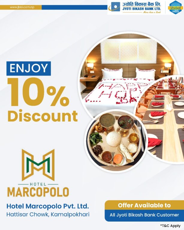 यस सम्झौतापश्चात्, ज्योति विकास बैंकका ग्राहकहरूले उक्त होटलमा खाना तथा रूम चार्जमा १० प्रतिशत सम्म छुट प्राप्त गर्न सक्नेछन् । ज्योति विकास बैंकले ग्राहकहरुको सुविधालाई प्राथमिकतामा राख्दै, देशका अन्य विभिन्न व्यवसायहरूसँग निरन्तर सहकार्य गर्दै, ग्राहकहरूलाई विशेष छुट र सुविधा प्रदान गर्दै आइरहेको छ ।
