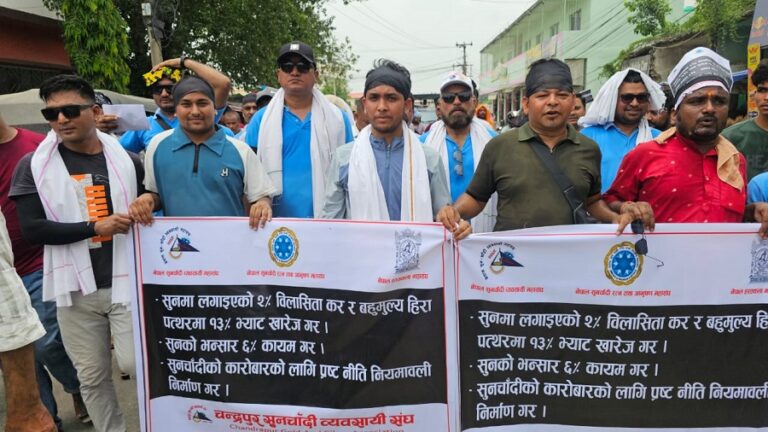 सरकारले बजेट वक्तव्य मार्फत लगाएको कर अव्यवहारिक भन्दै रौतहटका सुनचाँदी व्यवसायीले शुक्रवार सदरमुकाम गौरमा प्रदर्शन गरेका छन् । सुनमा लगाईको बिलासिता कर र हिरा जवाहरात पत्थरमा लगाएको मूल्य अभिवृद्धि कर खारेजीको माग गर्दै सुनचाँदी व्यवसायीले शुक्रवार सदरमुकाम गौरमा प्रदर्शन गरेका छन् ।