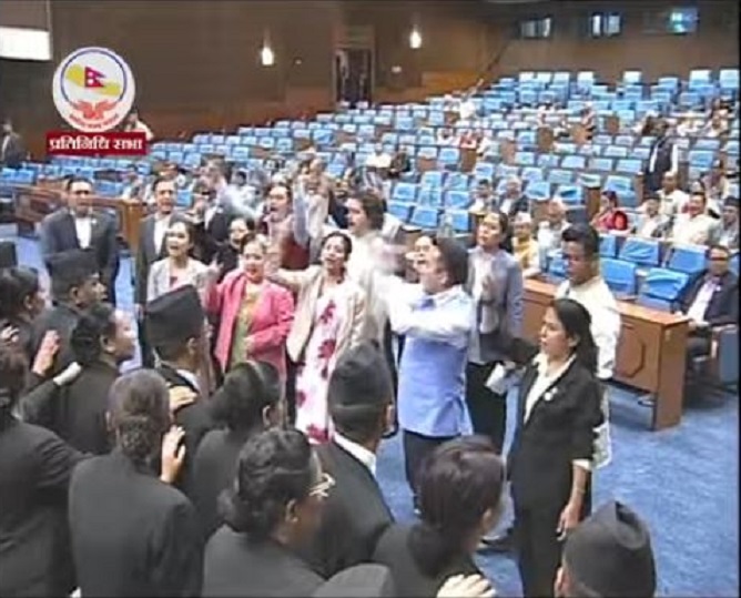 गृह मन्त्री लेखकले बोल्दै गर्दा रास्वपाले रोष्ट्रम पुगेर गरे नाराबाजी