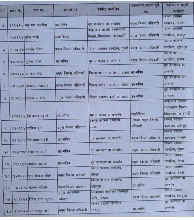 काठमाडौँ। गृह मन्त्रालयले विभिन्न जिल्लाका प्रमुख जिल्ला अधिकारी (प्रजिअ) हरुको सरुवा गरेको छ। हेर्नुहोस् सरुवा सूची: