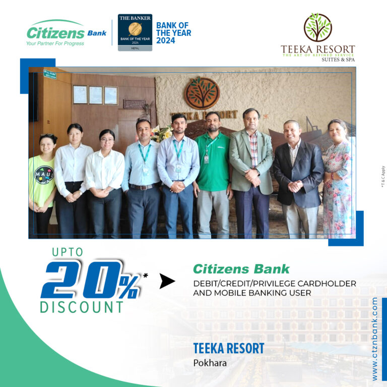 सिटिजन्स बैंक इन्टरनेसनल लिमिटेड र लेकसाइड पोखरास्थित टीका रिर्सोटबीच सिटिजन्स बैंकका ग्राहकलाई विशेष छुट दिने समझदारी पत्रमा हस्ताक्षर भएको छ ।