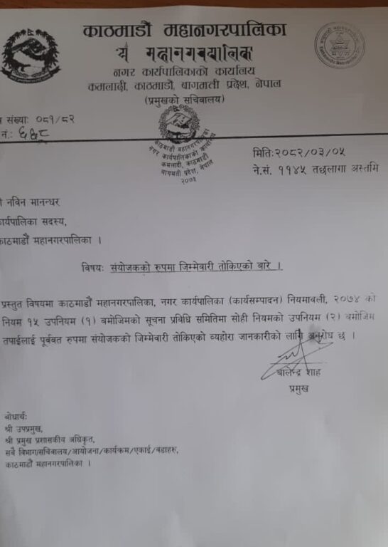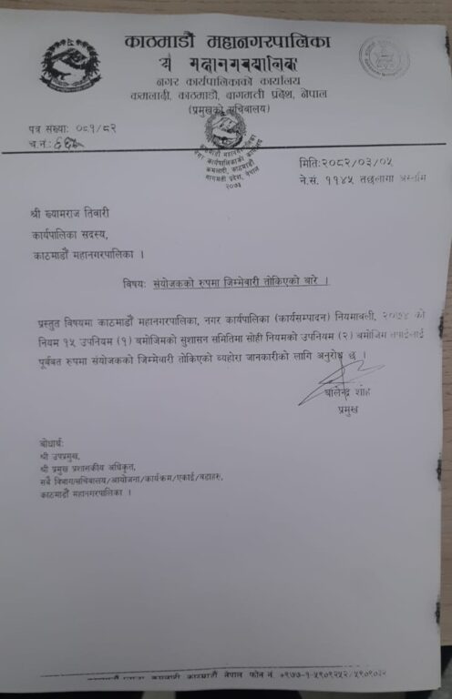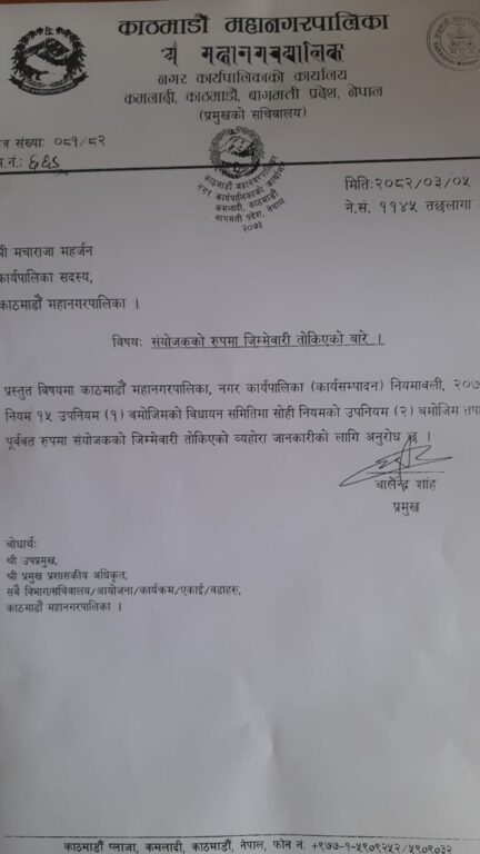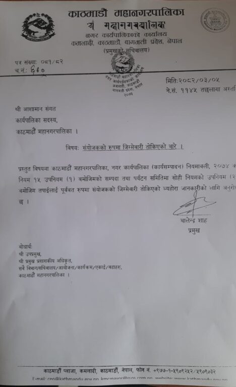 साहले आज दिउँसो करिब १ बजे कार्यपालिका अन्तर्गत ४ समितिका संयोजकलाई जिम्मेवारी दिएका हुन् । कामपा नगर कार्यपालिका (कार्य सम्पादन) नियमावली २०७४ को नियम १५ बमोजिम गठन भएको समितिका संयोजकलाई पुर्ववतः रुपमा संयोजकको जिम्मेवारी दिएको हो । जिम्मेवारी पाउनेहरुमा सूचना प्रविधि समितिका संयोजक एव. प्रवक्ता नविन मानन्धर, सुशासन समितिमा ख्यामराज तिवारी, सम्पदा तथा पर्यटन समितिमा आशामान संगत, विधायन समितिमा मचाराजा महर्जनलाई पुर्ववत संयोजक को जिम्मेवारी दिएको हो ।