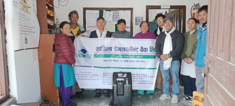 सांग्रिला डेभलपमेन्ट बैंक लिमिटेडले मुस्ताङको घरपझोङ गाउँपालिका–३ स्याङ गाउँमा रहेको स्याङ आधारभूत स्वास्थ्य सेवा केन्द्रलाई स्वास्थ्य सामग्री ‘अक्सिजन कन्सेन्ट्रेटर’ हस्तान्तरण गरेको छ ।