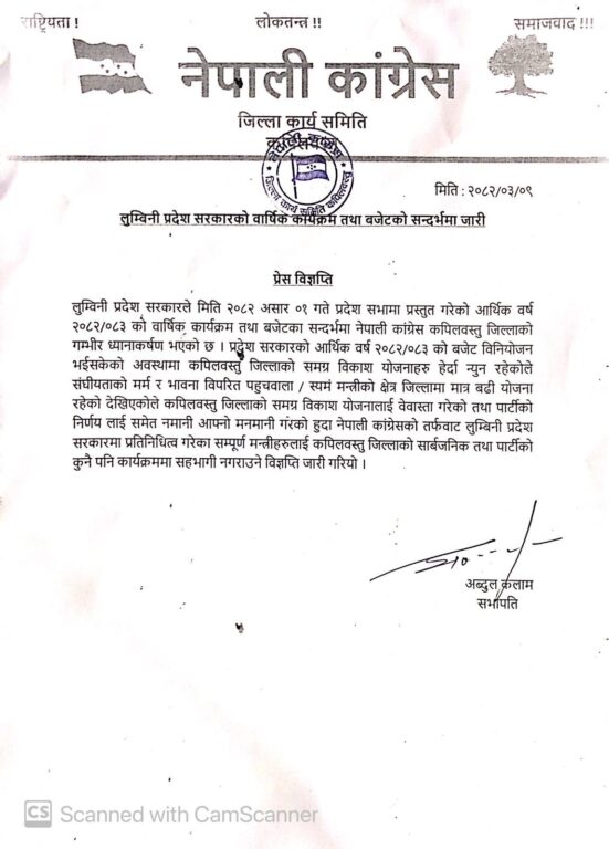 त्यस्तै विनियोजित बजेटमा कपिलवस्तु जिल्लाको समग्र विकास योजनाहरु हेर्दा न्यून रहेकोले सङ्घीयताको मर्म र भावना विपरीत पहुँचवाला, स्वयम मन्त्रीको क्षेत्र जिल्लामा मात्र बढी योजना रहेको देखिएकोले पार्टीको निर्णयलाई समेत नमानी आफ्नो मनमानी गरेको हुँदा नेपाली कांग्रेसको तर्फबाट लुम्बिनी प्रदेश सरकारमा प्रतिनिधित्व गरेका सम्पूर्ण मन्त्रीहरुलाई कपिलवस्तु जिल्लाको सार्वजनिक तथा पार्टीको कुनै पनि कार्यक्रममा सहभागी नगराउने निर्णय गरिएको विज्ञप्तिमा उल्लेख छ ।