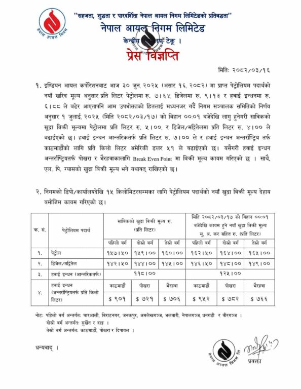 त्यस्तै आन्तरिक हवाई इन्धनमा ७ रुपैयाँ र अन्तर्राष्ट्रिय हवाई इन्धनमा प्रति किलोलिटर ६० डलर मूल्य बढेको छ ।