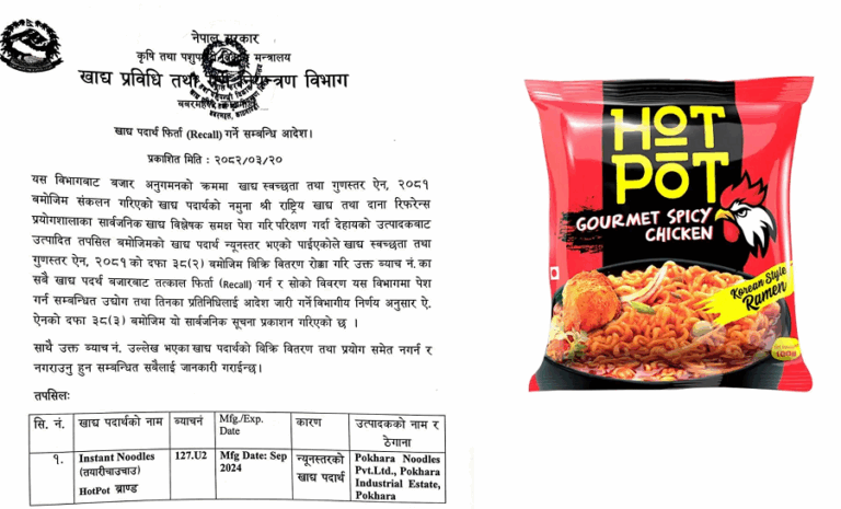 गुणस्तर परीक्षणमा फेल भएपछि खाद्य प्रविधि तथा गुण नियन्त्रण विभागले पोखरा नुडल्स प्रा.लि.द्वारा उत्पादित ‘हटपट’ ब्रान्डको चाउचाउ बजारबाट तत्काल फिर्ता गर्न निर्देशन दिएको छ ।