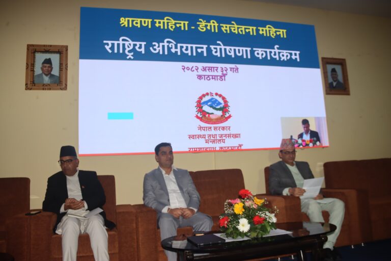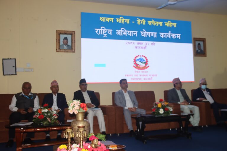 नेपाल सरकारले साउन महिनालाई ‘डेंगी सचेतना महिना’ को रूपमा घोषणा गर्दै राष्ट्रिय अभियान सुरु गरेको छ। स्वास्थ्य तथा जनसंख्या मन्त्री प्रदीप पौडेलले बुधबार राजधानीमा आयोजित एक विशेष समारोहकाबीच अभियानको औपचारिक सुरुवात गरेका हुन्। साउन महिनामा डेंगी संक्रमण उच्च हुने तथ्यांकका आधारमा सचेतना अभिवृद्धि र संक्रमण नियन्त्रणका लागि यो कदम उठाइएको बताइएको छ।