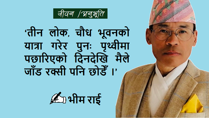 बेलायती सैनिक जीवन व्यतित गरिसकेपछि त्यस दिन माछा र रोटीसँग भरपुर वाइन पिइयो । त्यहाँदेखि निस्केर समुन्द्री किनारमा अंग्रेज चालकले पार्क गरेर राखेको मोटर नजिक जाँदै थियौं । मलाई अचानक रिङ्टा लाग्यो । सारा समुन्द्र ममाथि नै घोप्टिर आएझैँ भान भयो । सपना हो वा विपना केही थाहा भएन । शरीर थर्रर काप्यो । त्यसपछि थुँचुक्कै भुँइमा बसें । दुवै हात टाउकोमा राखे, शीर शिशिल भयो । तारा पनि आत्तिइन् । आज मेरो अन्तिम दिन रहेछ भन्दै देवी देवता, परिवार, आफन्त, इष्टमित्र सबैलाई सम्झिएँ । तीन लोक, चौध भूवनको यात्रा गरेर पुनः पृथ्वीमा पछारिएको दिनदेखि मैले हो, जाँडरक्सी पनि छोडेँ ।