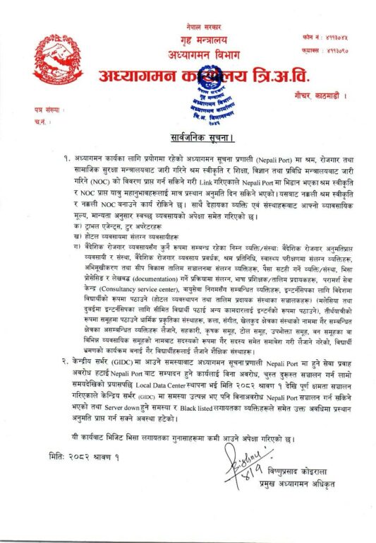यस सूचना अनुसार, अध्यागमन विभागका प्रमुख अध्यागमन अधिकृत विष्णुप्रसाद कोइरालाले सर्वसाधारण र सरोकारवालाहरूलाई नयाँ प्रणालीको पालनामा सहयोग पुर्याउन आग्रह गरेका छन्।