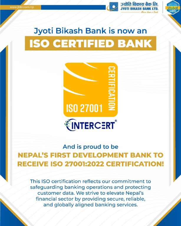 नेपालको बैंकिङ्ग क्षेत्रमा एक ऐतिहासिक सफलता हात पार्दै, ज्योति विकास बैंक लिमिटेडले सूचना सुरक्षा व्यवस्थापन प्रणालीमा अन्तर्राष्ट्रिय स्तरको आईएसओ २७००१ः२०२२ प्रमाणपत्र प्राप्त गरेको छ । यससँगै, सूचना सुरक्षा सर्टिफिकेसन प्राप्त गर्ने नेपालकै पहिलो विकास बैंक बन्ने कीर्तिमान बैंकले राखेको छ ।